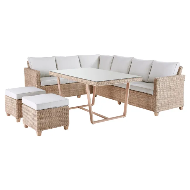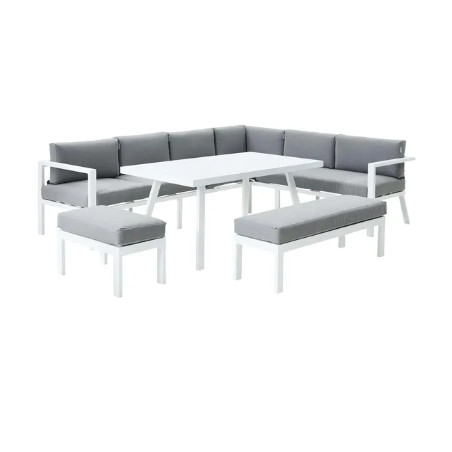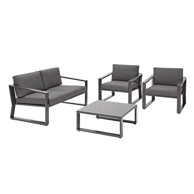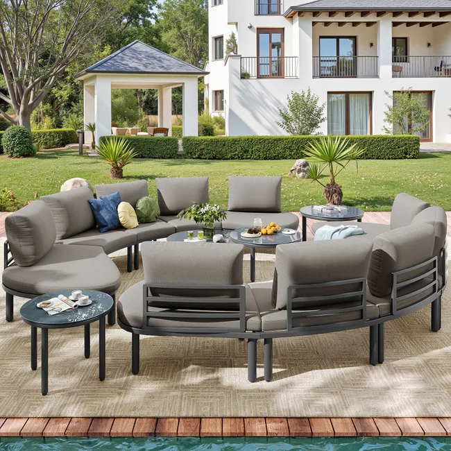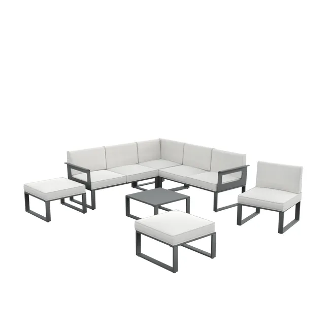 Salon de jardin modulable acier galvanisé gris – 10 places avec 4 tables en verre